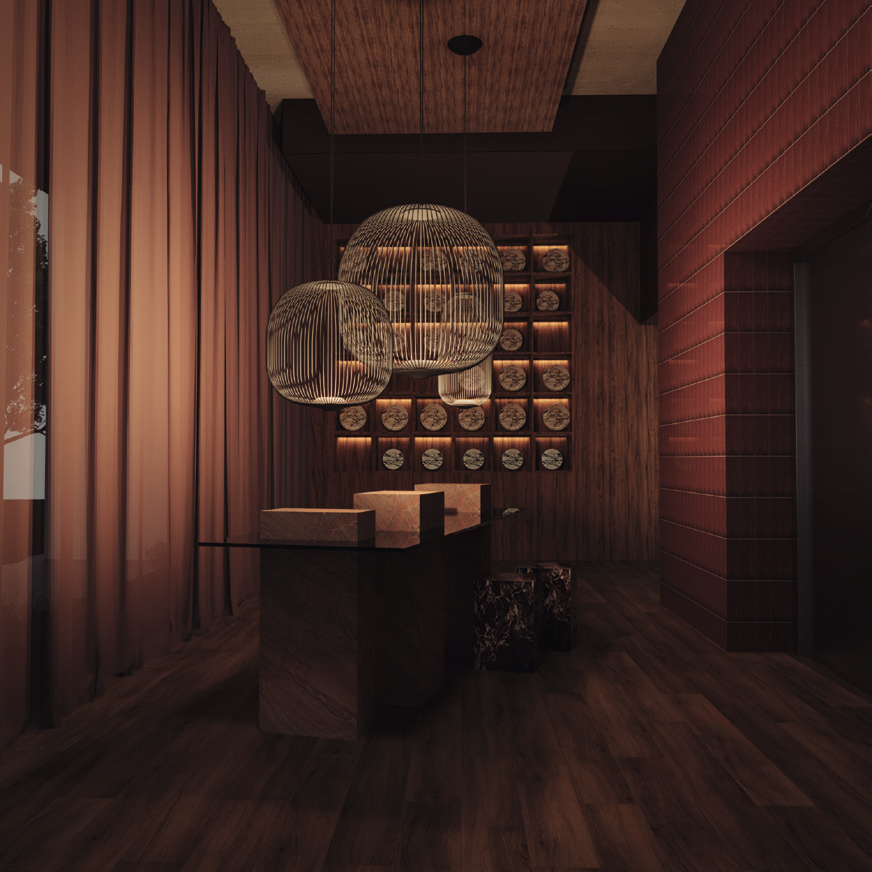 Este lobby es un territorio de transición, un umbral entre distintas experiencias. Nos propusimos crear un entorno sensorial donde los sonidos, los aromas y las texturas dialogan con los visitantes. Invitamos a detenerse un momento, a compartir una copa, a contemplar una obra de arte, a sentir la presencia de la naturaleza reinterpretada.
